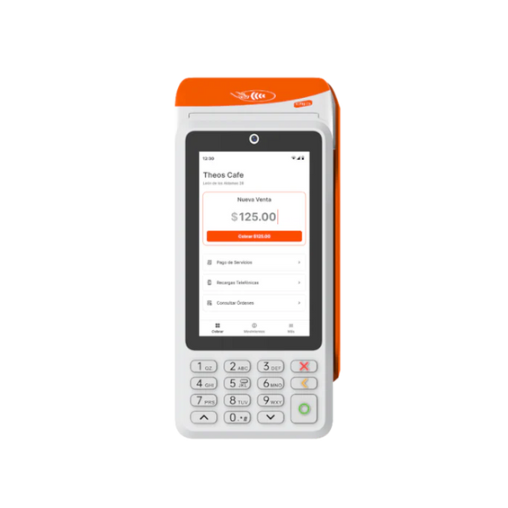 Impresora térmica, SIM, materiales resistentes, teclado físico retroiluminado, diseño elegante, batería de larga duración.